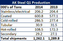 AK Steel reported a net loss of $86.1 million in the first quarter of 2014, compared to a net income of $35.2 million in the previous quarter. Net sales for Q1 were $1.38 billion on steel shipments of 1,262,100 tons, compared to Q1 2013 net sales of $1.37 billion on shipments of 1,289,800 tons, and net sales of $1.46 billion on shipments of 1,420,000 tons for the fourth quarter of 2013.