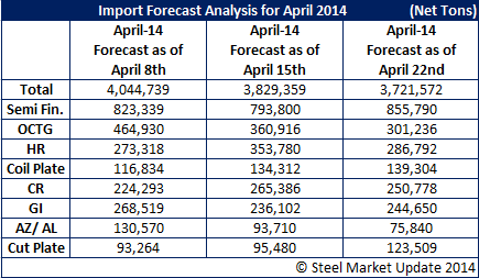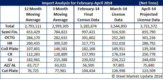 Foreign steel imports, for the month of April 2014 are projected by Steel Market Update to exceed 3.5 million net tons. Based on preliminary license data collected by the U.S. Department of Commerce through April 22, 2014 imports could reach as high as 3.7 million net tons. However, as our regular readers already know, license data can be quite suspect and the final numbers could vary by a few hundred thousand tons.