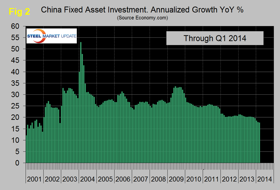 Figure 2 shows the growth of fixed asset investment y/y. The growth rate has been declining for over four years. We understand that the data includes real-estate purchases so is not a direct reflection of constructional steel demand. We are assuming that the steel on the ground portion of this data follows the overall trend and this is in line with the stated objective to rebalance the economy in favor of consumer consumption. By industry, investment in mining slowed to 12.1 percent in the year to March, up from the 10.2 percent in the year to February. Investment in oil and gas expanded 18.7 percent, capital spending on ferrous metals rose 17.1 percent, and investment in non-ferrous metals rose 0.3 percent. Moody’s Economy.com reported as follows. “Tight lending standards, uncertainty over the shadow banking sector and tight property restrictions will constrain investment over the coming quarters. We expect growth in nominal fixed investment will ease toward 15 percent by the end of 2014. However, the government’s mini-stimulus and attempts to restart rail investment will add some upside, while strengthening global demand should lift investment in export-facing industries.”