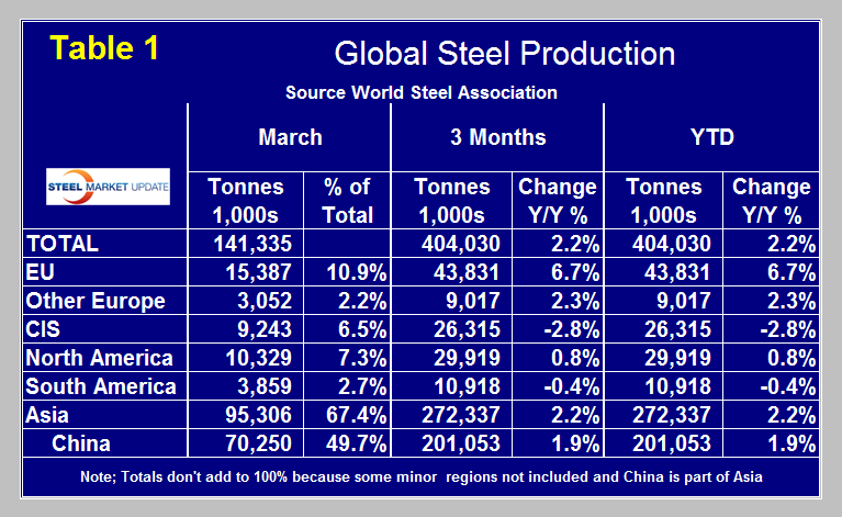 Capacity is now 2.076 billion tonnes. Table 1 shows regional production in March with regional share of the global total, also three months production through March and YTD production(which is the same thing this month.) In the three months through March y/y growth was 2.2 percent. All regions except the CIS and South America had positive y/y growth in the three months through March with the European Union continuing to lead the way. The growth of China’s steel output has slowed for each of the last five months on a 3MMA basis and in March was 1.9 percent, down from 12.4 percent in March last year. It is still too soon to tell if the growth of China’s production really is being reigned in but the signs are encouraging. North America and China produced 7.3 percent and 49.7 percent of the global total in March, respectively, which was the exact same as February. Source World Steel Association.