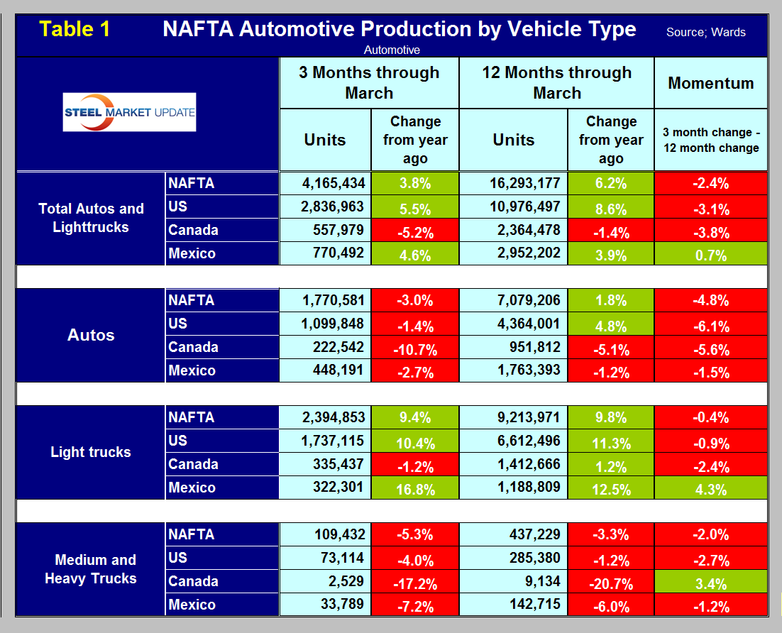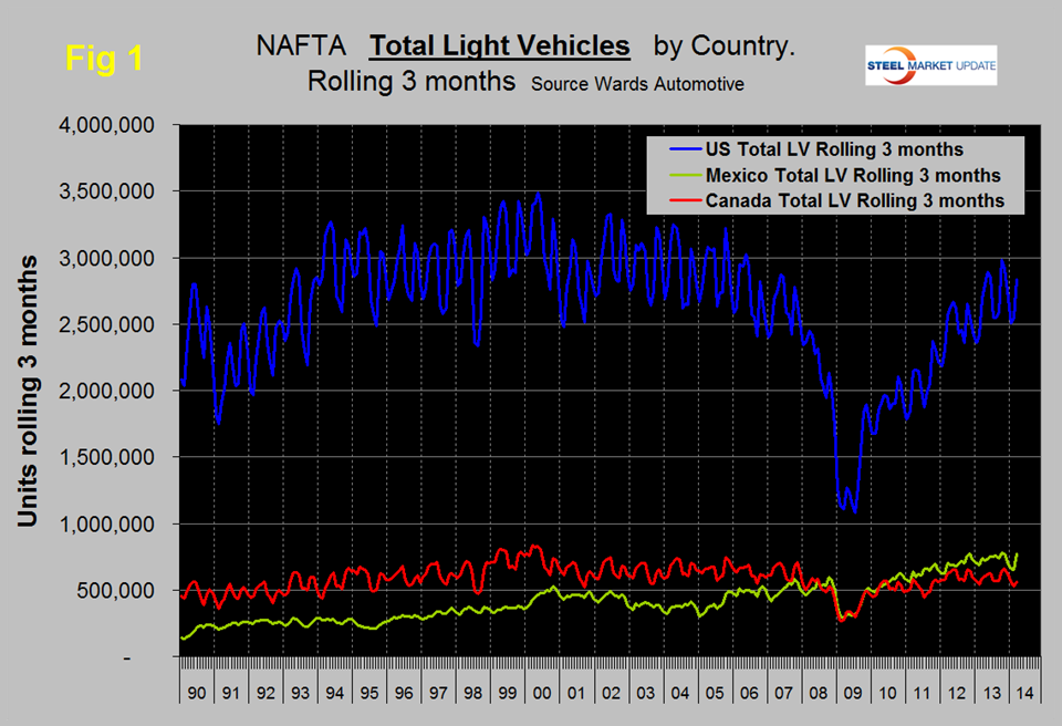 Light vehicle production in NAFTA increased by 7.0 percent in March to an annual rate of 17.794 million units. The US, Canada and Mexico grew by 6.9 percent, 2.1 percent and 11.4 percent respectively. It’s too soon to tell if this is the beginning of a trend, the first quarter results year over year are not so stellar. Table 1 shows the growth of autos, light trucks and medium and heavy trucks on a quarterly basis and a rolling 12 months year over year. Compared to Q1 2013, the production of autos and medium and heavy trucks declined in all three nations in Q1 2014. The production of light trucks increased in the US and Mexico but declined in Canada.