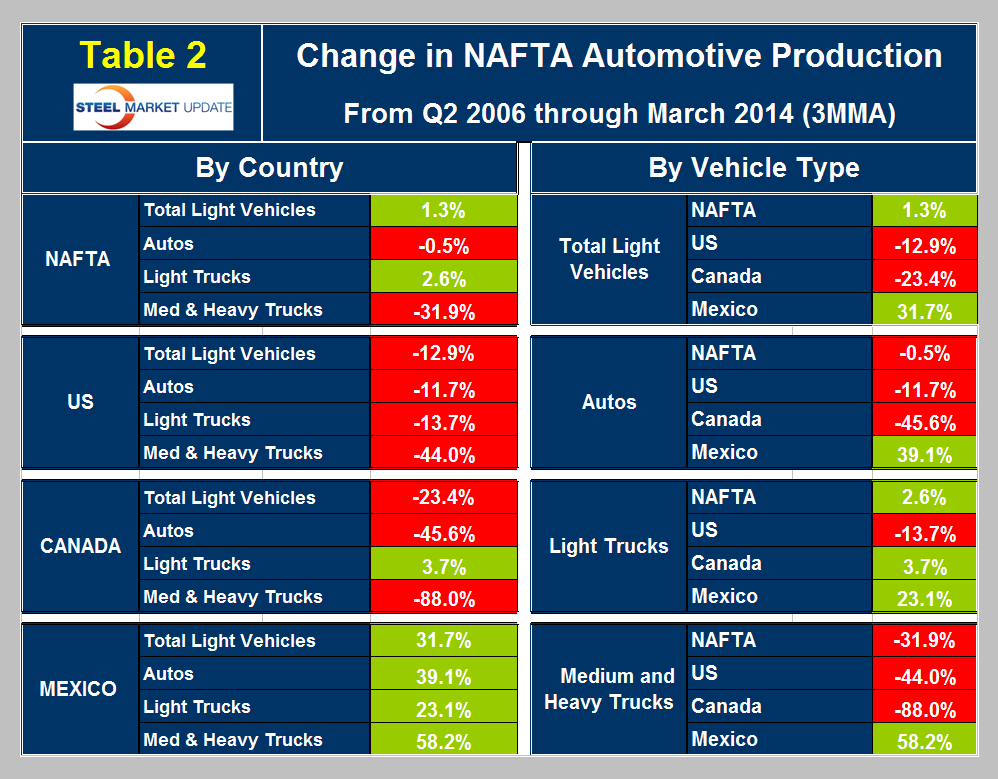 Total light vehicle production in NAFTA is now 1.3 percent higher than it was in the pre-recessionary peak of Q2 2006 but there is a big difference between the recoveries of the three nations. The US is still down by 12.9 percent, Canada by 24.4 percent as Mexico is up by 31.7 percent, (Table 2).