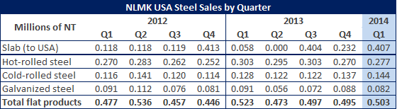 There were a large number of slabs shipped from Russia to NLMK USA during the first quarter 2014. NLMK USA received 407,000 tons during the first quarter. Compare that number against the 58,000 tons received during Q1 2013 and 118,000 tons during Q1 2012.