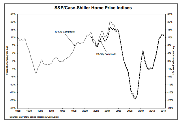 “Despite continued price gains, most other housing statistics are weak,” said David M. Blitzer, Chairman of the Index Committee at S&P Dow Jones Indices. “Sales of both new and existing homes are flat to down. The recovery in housing starts, now less than one million units at annual rates, is faltering. Moreover, home prices nationally have not made it back to 2005. Mortgage interest rates, which jumped in May last year and are steady since then, are blamed by some analysts for the weakness. Others cite difficulties in qualifying for loans and concerns about consumer confidence. The result is less demand and fewer homes being built.