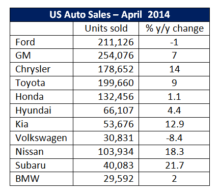 Ford sales fall 1 percent below April 2013 levels, hurt by lower industry fleet orders and weaker demand on passenger cars and light trucks. Volkswagen US sales were down 8.4 percent for the month bringing its year to date total 10.4 percent below sales for the first four months of 2013.
