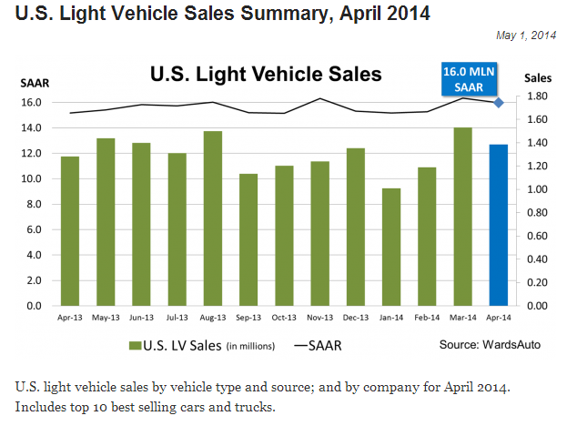 Automotive sales were encouraging in April, with most auto manufacturers posting positive gains year over year. WardsAuto reports sales totaled 1.37 million units compared to 1.18 million in April 2013. Sales reached a seasonally adjusted annual rate (SAAR) of 16.0 million for the second consecutive month.
