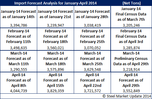 Our expectation is for total April imports to come in around 3.4 to 3.5 million net tons. As you can see by the table below the projected numbers on the total have shrunk as the month progressed. However, many of the individual items which we watch closely on our list have remained fairly constant.