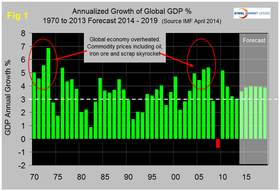 Figure 1 shows the history and forecast of Global GDP from 1970 through 2019. The “grey hairs” among our readers will have recognized the similarity between the years 1974 / 75 and 2008 / 09 when sustained global expansion in the 5 percent range led to an extreme commodity bubble / bust which is still reverberating in our businesses. The IMF forecast through 2019 shows no sign of such a return and if history repeats itself we should be safe until 2043!