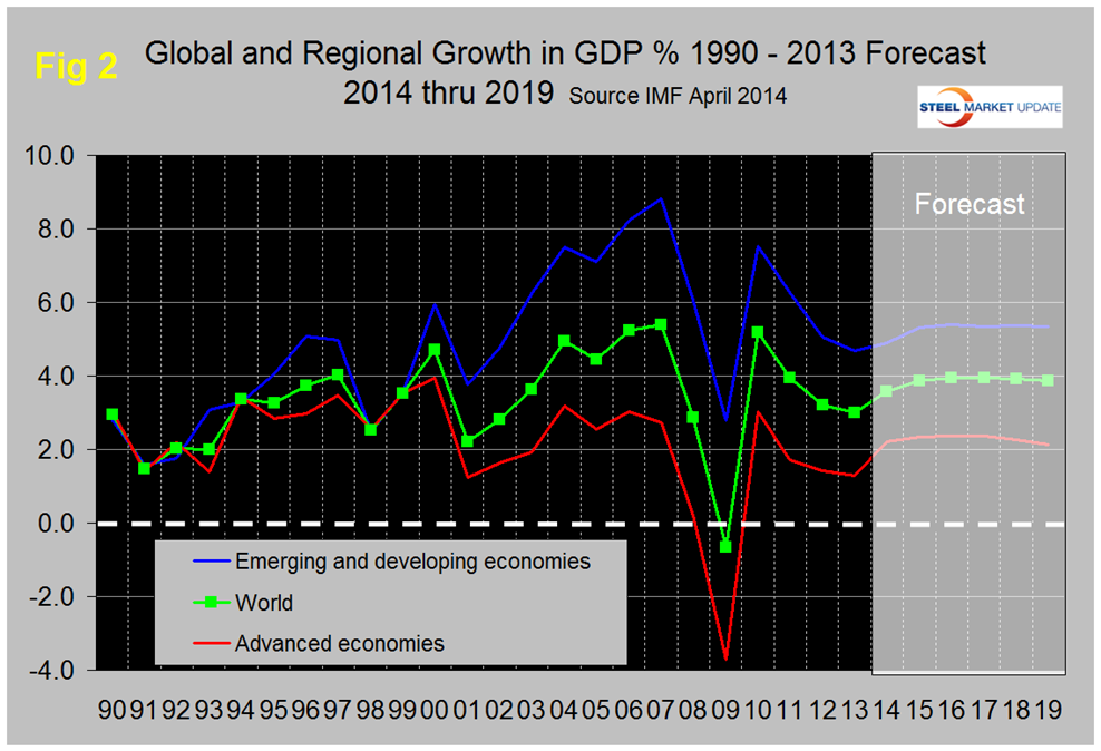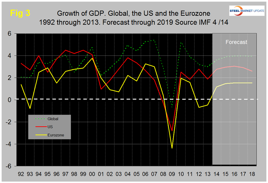 Last week the IMF revised its forecast for global / regional and national GDP growth through 2019. The new forecast calls for an expansion of global GDP from 3.0 percent in 2013 to 3.6 percent in 2014 and stabilizing at around 3.9 percent in the years 2015 through 2019.