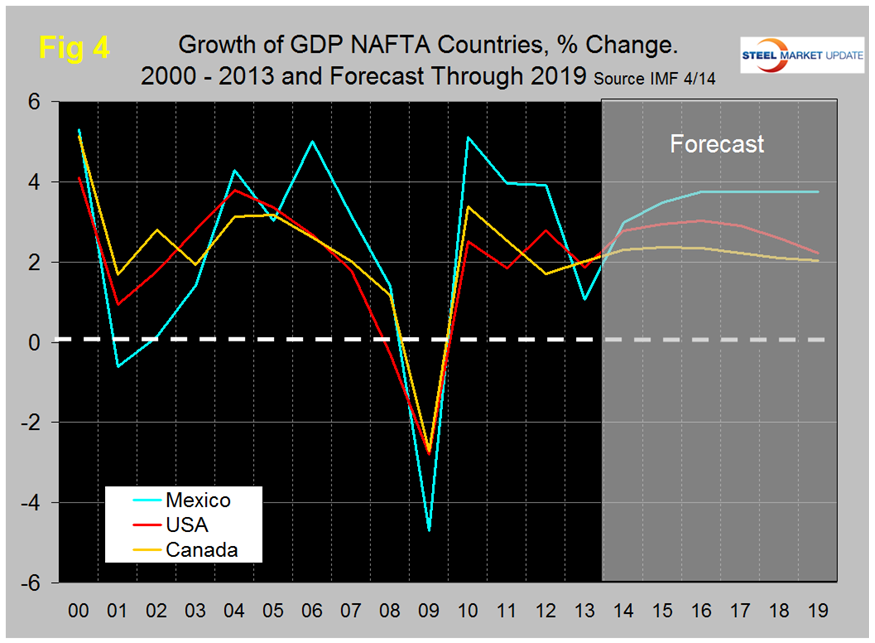 The IMF forecast calls for a 2.8 percent growth in the US economy this year rising to 3.03 percent in 2016 and declining to 2.2 percent in 2019. The developing world will not see a return to the blistering growth that they enjoyed before the recession, (Figure 2), the US will continue to outperform the Eurozone, (Figure 3), and Mexico which had the lowest growth rate in NAFTA last year will take the lead again this year, (Figure 4).