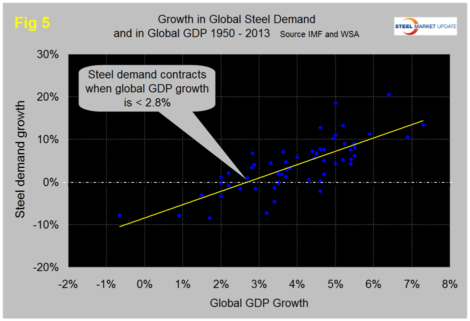 Secondly, as discovered by our friends at “Steel Guru” is that 1 percent growth in GDP does not result in 1 percent growth in steel demand. At the global level it takes a 2.8 percent increase in GDP to get any increase in steel demand (Figure 5). This is a long term average over a period of 64 years and based on the added volatility of steel can be a predictor of the immediate future. For example, after the disastrous decline in steel demand in 2009 there was no doubt that a huge cyclical rebound would occur as inventory managers throughout the world began to react to the economic recovery. If the IMF forecast proves to be correct then the growth in steel demand through 2019 will settle in close to the yellow line in Figure 5 with a growth in steel demand of about 3.5 percent per year. We confess we haven’t yet figured out why the growth of steel and the economy don’t cross at zero but it does appear to be a fact that is born out in our examination of the US steel and cement markets and also by the steel market in Thailand for which we happened to have some data. In the US steel market it requires about 2 percent growth in GDP to generate growth in steel demand therefore again if current forecasts prove to be correct regarding the US economy we can expect the steel market to expand through 2019. This recovery in the US should exceed the long term average as construction digs its way out and manufacturing re-shores to the US.