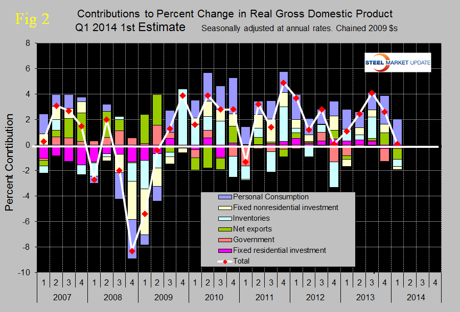 Figure 2 shows the contribution, (or lack of) for the major components. Personal consumption held up quite well and contributed 2.04 percent. All other components at this drill down level were negative including both the residential and non-residential measures of construction. Net exports had the largest negative contribution followed by inventories which when they decline in volume detract from GDP.