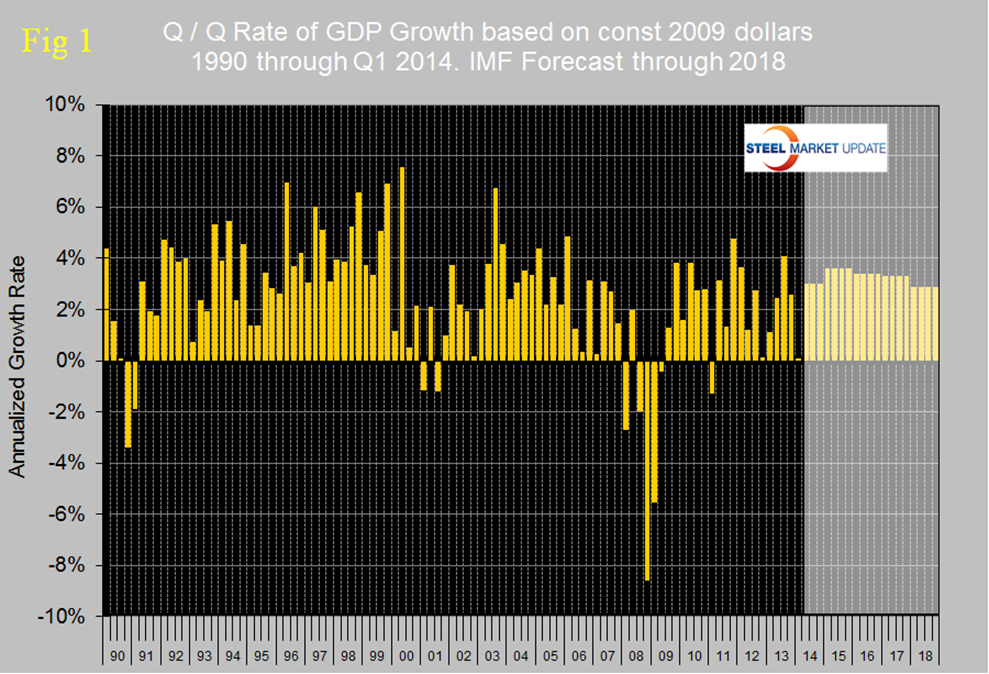 The Bureau of Economic Analysis (BEA) released their first estimate of real GDP today, (April 30th) for Q1 2014. GDP rose in the fourth quarter by 2.6 percent but declined to 0.1 percent in the first estimate for Q1 2014. Figure 1 shows quarterly results since 1990 with the IMF forecast through 2018. The Q1 result was far worse than most economist’s expectations which had been for a gain of 1.1 percent. Results are reported at a seasonally adjusted annual rate.