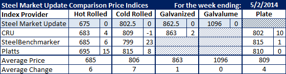 This past week three of the four flat rolled steel price indexes followed by Steel Market Update (SMU) reported only modest gains in benchmark hot rolled pricing with SMU being the most conservative holding our pricing at the same levels as we had reported the prior week. Platts was the one exception as their hot rolled numbers increased $15 per ton to a $695 per ton average. We once again have a $20 spread between the highest and lowest index. The hot rolled average of the four indexes is now $685 per ton.
