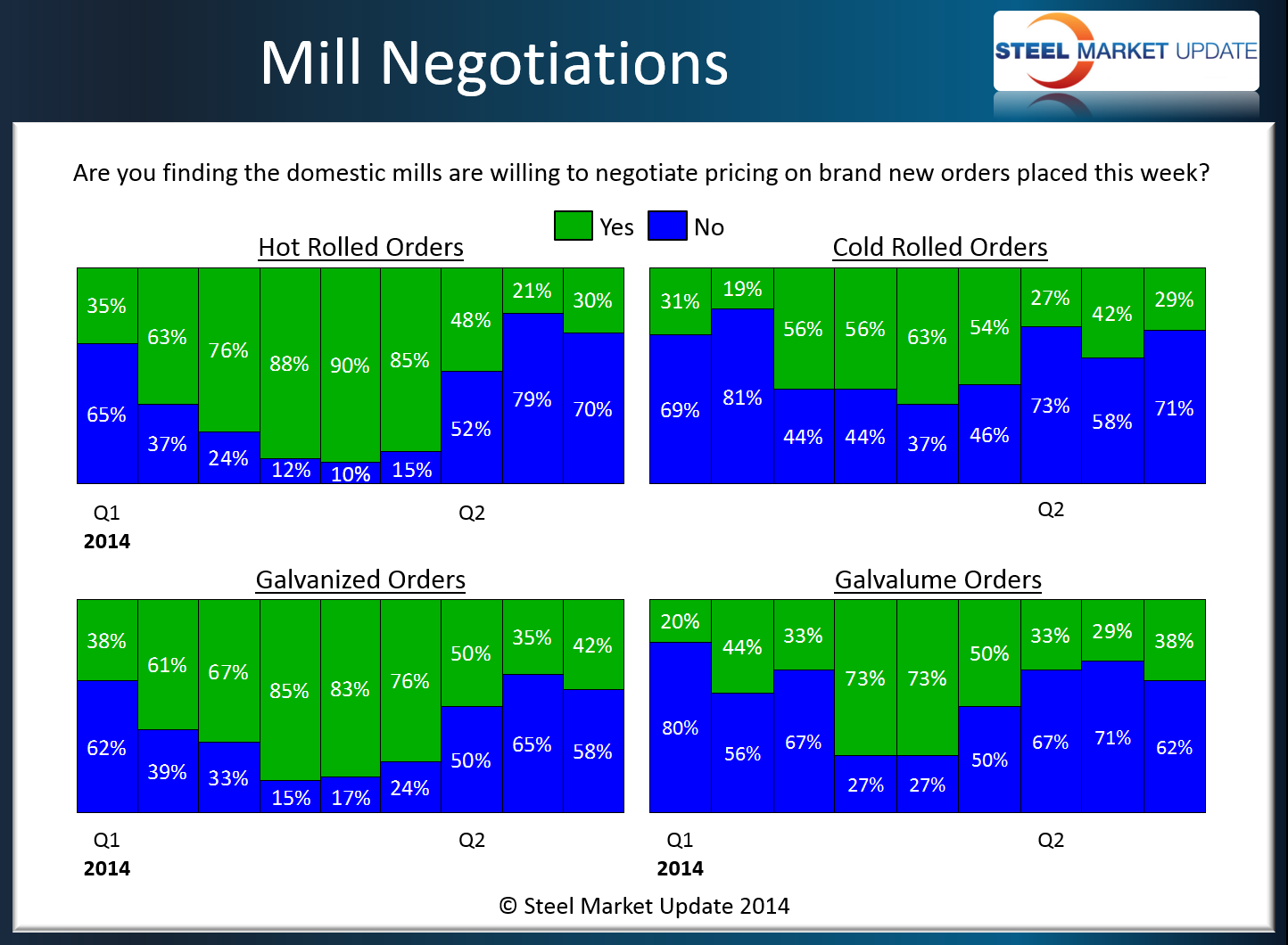 The domestic steel mills continue to be united in their approach to negotiating flat rolled steel pricing. Based on data collected this week from our flat rolled steel market survey, we found that only 30 percent of the respondents were reporting the domestic mills as willing to negotiate hot rolled steel pricing. This is up from the cycle low of 21 percent reported during the middle of April. The cold rolled response rate pulled back from 42 percent in mid-April to 29 percent this week. Galvanized was the most negotiable items according to our respondents with 42 percent reporting the mills as willing to discuss GI prices. Galvalume came in at 38 percent.
