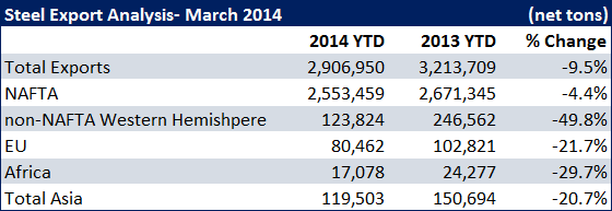 While exports to both Canada and Mexico showed nominal increases over March 2013, total steel exports were down 5.5 percent from a year earlier, as exports to many smaller trading partners dropped precipitously, including a nearly 25 percent year-over-year decline for European Union countries. The U.S. is seeing strong growth in exports to Venezuela, China and Brazil compared to 2013, however. While those nations account for just 3.6 percent of the country’s exports, that percentage is 2½ times larger than it was a year ago. Year-to-date exports to those three countries have also increased – by a factor of five, in Venezuela’s case – even as weak January and February numbers produced a 9.5 percent drop in total exports for the first three months of the year.