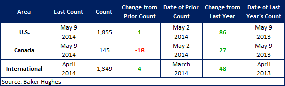 According to Baker Hughes data from May 9th, 2014, the U.S rig count for this week is 1,855 rigs exploring for or developing oil or natural gas. This count is an increase of 1 rigs when compared to last week, with oil rigs up 1 to 1,528 rigs, gas rigs unchanged at 323 rigs, and miscellaneous rigs unchanged at 4 rigs. Compared to last year the 1,855 count is an increase of 86 rigs, with oil rigs up by 116, gas rigs down by 27, and miscellaneous rigs down by 3.