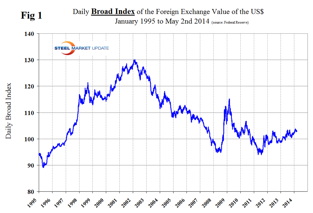 Explanation of data sources: The broad index is published by the Federal Reserve on both a daily and monthly basis. It is a weighted average of the foreign exchange values of the U.S. dollar against the currencies of a large group of major U.S. trading partners. The index weights, which change over time, are derived from U.S. export shares and from U.S. and foreign import shares. The data are noon buying rates in New York for cable transfers payable in the listed currencies. At SMU we use the historical exchange rates published in the Oanda Forex trading platform to track the currency value of the US $ against that of sixteen steel trading nations. Oanda operates within the guidelines of six major regulatory authorities around the world and provides access to over 70 currency pairs. Approximately $4 trillion US $ are traded every day on foreign exchange markets. Currencies of the steel trading nations as reported by Oanda do not necessarily track with the Federal Reserve Broad Index and, in fact, often move in the opposite direction.