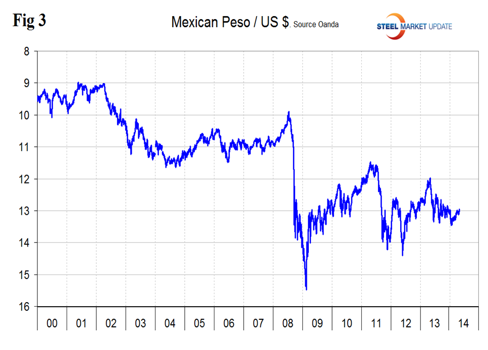 The Canadian $ and the Mexican Peso have both been strengthened against the dollar for most of 2014 and by similar amounts. This raises US competitiveness within NAFTA, (Figure 2 and Figure 3)