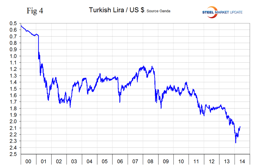 The Turkish Lira has recovered from its all-time low of 2.3299 / US $ on January 26th to 2.077 on May 9th, (Figure 4). What makes currency values counter intuitive and difficult to explain is that in the case of Turkey, for example, a lower number means the currency is stronger.