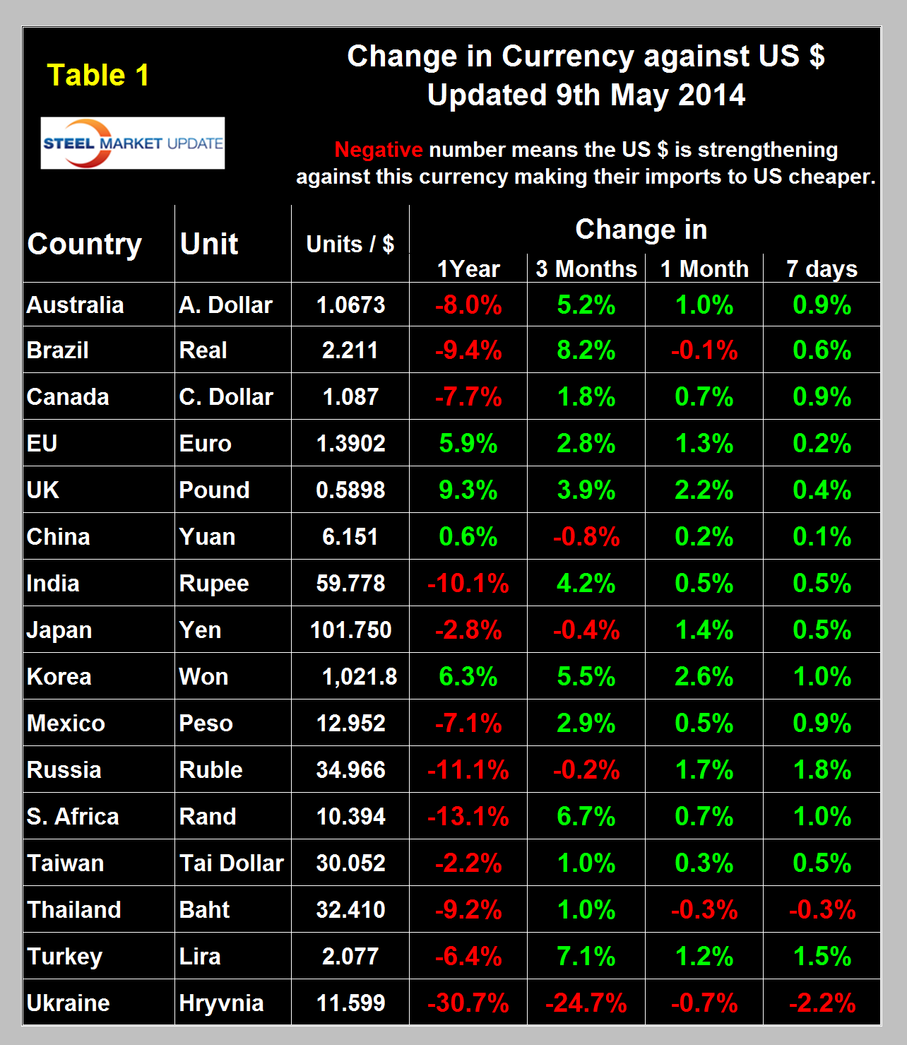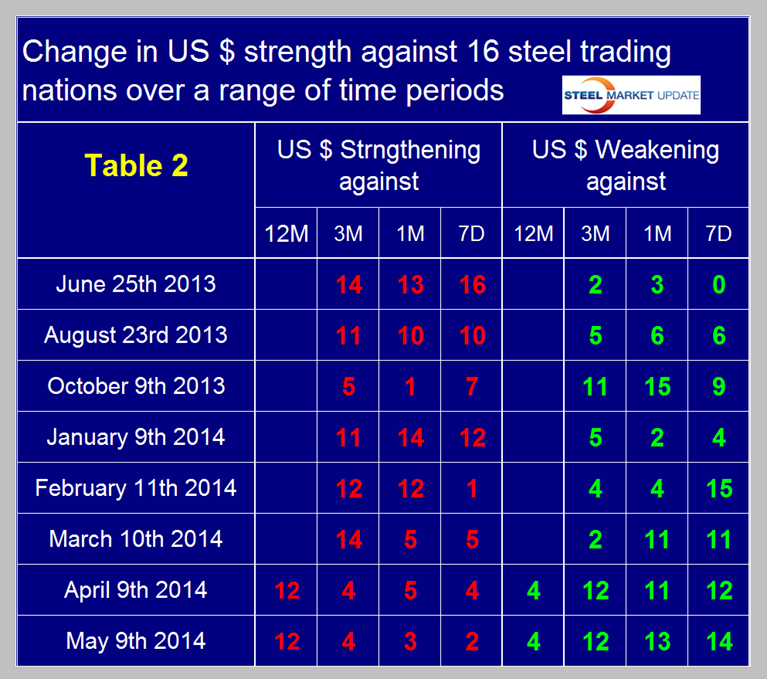 Table 1 shows the number of currency units that it takes to buy one US $ and the percent change in the last year, three months, one month and seven days. In the last year the US $ has strengthened against twelve of the currencies of the major sixteen steel trading nations. Table 1 is color coded to indicate strengthening in red and weakening in green. We regard strengthening as negative and weakening as positive because the effect on net imports. Since we did this analysis in March there has been a very significant swing towards a weaker dollar, (green) to the extent that in the last three months the US $ weakened against twelve of the sixteen steel trading currencies and in one month weakened against thirteen. This trend continued in the last seven days during which time the dollar weakened against fourteen of the steel trading currencies. At the present time the currencies of the steel trading nations are on balance moving in the opposite direction to the Broad Index. At SMU we regard this subject to be the most complicated and difficult to explain of anything we publish.