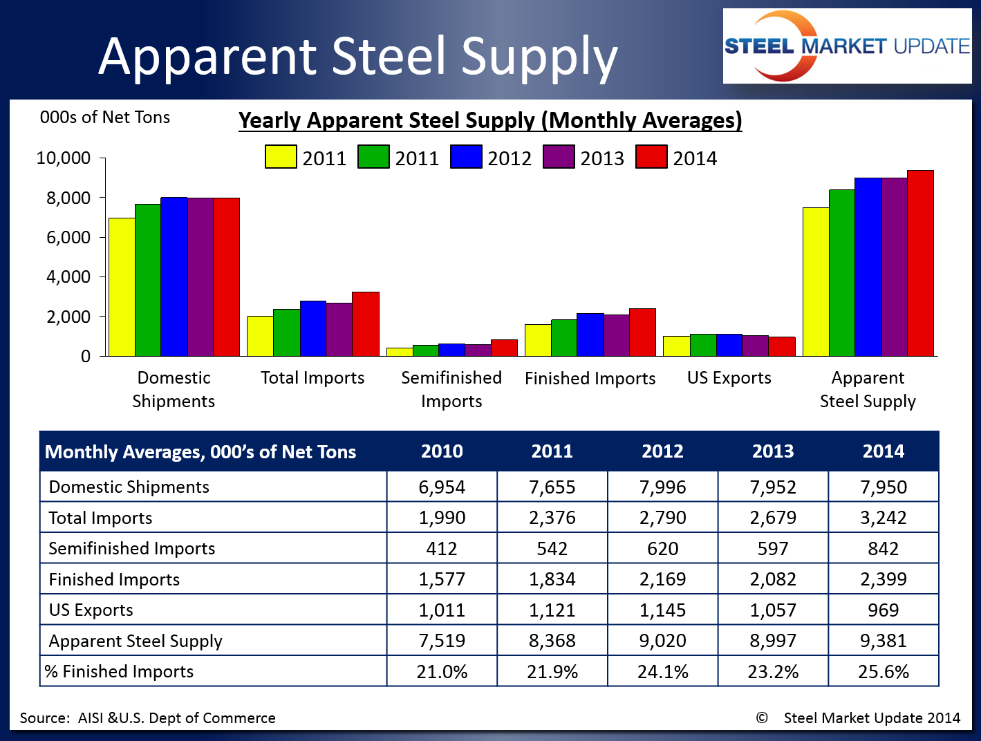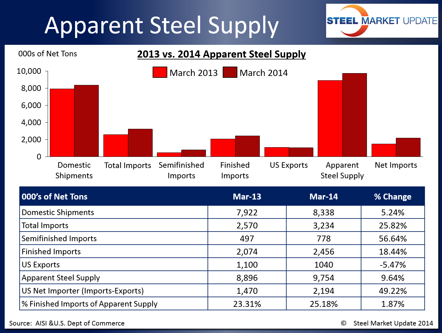 Apparent steel supply for March was 9,753,954 net tons, a 9.6 percent increase compared to the same month one year ago. This is due to an increase in domestic shipments and finished imports and a slight decrease in total US exports. The net trade balance between imports and exports was a surplus of 2,194,246 net tons in March, an increase of 49.2 percent from the same month last year. Finished imports took another 1.87 percent of domestic market share and for the month of March imported steel had 25.18 percent of the total market.