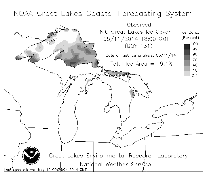 Shipping delays of iron ore on the Great Lakes are finally over. Ice coverage on the Great Lakes is down to 9.1 percent with the remaining ice concentrated in Lake Superior. According to satellite imagery, about 22 percent of Superior is still covered.