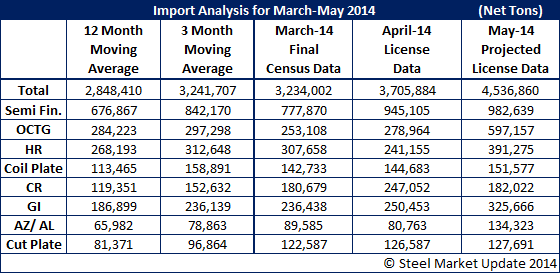 The U.S. Department of Commerce released their latest imported steel license data for the month of May 2014. The early indication is for May steel imports to remain at, or above the projected April imports of 3.7 million tons. March final imports came in at 3.2 million which is also our 3 month moving average.