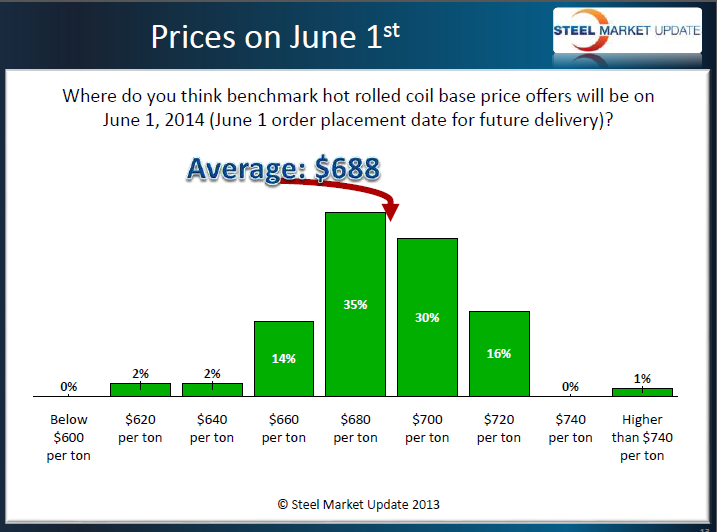 When you get to June 1st, those responding to our questionnaire believe the spot price will average $688 per ton which is right in line with current index averages for this week. We have provided the responses so you can get a feel for the balance of the responses.