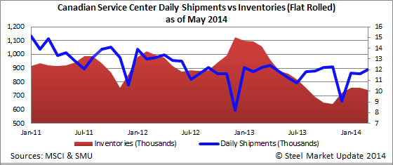 Canadian steel service center shipments for all steel products during the month of April were 496,300 net tons, a decrease of 0.7 percent from the month before, and a decrease of 5.6 percent from April 2013. Inventories at the end of the month stood at 1,431,800 tons, a decrease of 2.7 percent from last month, and a decrease of 11.7 percent from the same month one year ago. The daily average receipt rate for April was 21,682 tons (21 day month), down from 27,404 tons the prior month (21 day month as well). Total April receipts were 120,400 tons lower than March. According to the Metal Service Center Institute, total months on hand stood at 2.9 months unadjusted or 3.1 months on a seasonally adjusted (SA) basis.