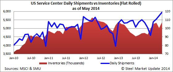 US steel service centers shipments for all steel products during the month of April were 3,087,300 net tons, an increase of 3.6 percent from the March shipments, and an increase of 4.9 percent from April 2013 levels. Steel inventories at the end of the month were 8,617,500 tons, an increase of 4.3 percent from the month before, and an increase of 3.7 percent from the same month last year. The daily average steel receipt rate for April was 198,051 tons per day (21 day month), up from 160,154 tons per day from the prior month (also a 21 day month). Total April steel receipts were 796,100 tons higher than the March figure. According to the Metal Service Center Institute (MSCI), total months on hand stood at 2.3 months unadjusted or 2.4 months on a seasonally adjusted (SA) basis.