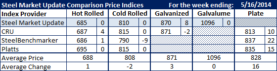 With the exception of plate, flat rolled steel prices either moved sideways or slightly lower based on the steel indexes followed by Steel Market Update. Prices appear to have peaked with benchmark hot rolled averaging $688 per ton, cold rolled $808 per ton, galvanized .060″ G90 $871 per ton and Galvalume .0142″ AZ50, Grade 80 $1096 per ton.