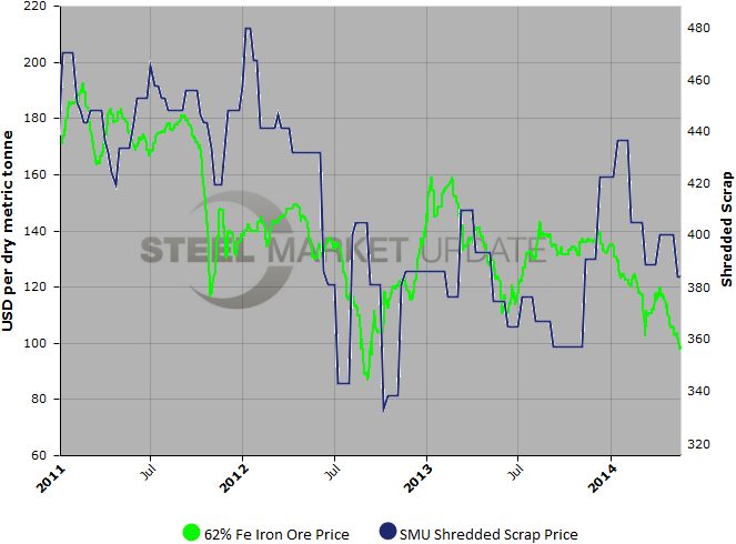 Iron ore spot prices in China have been falling and may continue to decline to the lows last seen in September 2012 when prices for 62% Fe fines reached into the $80’s (currently trading at $97.5/dmt). Steel Market Update has been reviewing the relationship between iron ore and ferrous scrap prices using shredded scrap as our base product. We have been told in the past that there was a direct relationship between the products (see graphic).