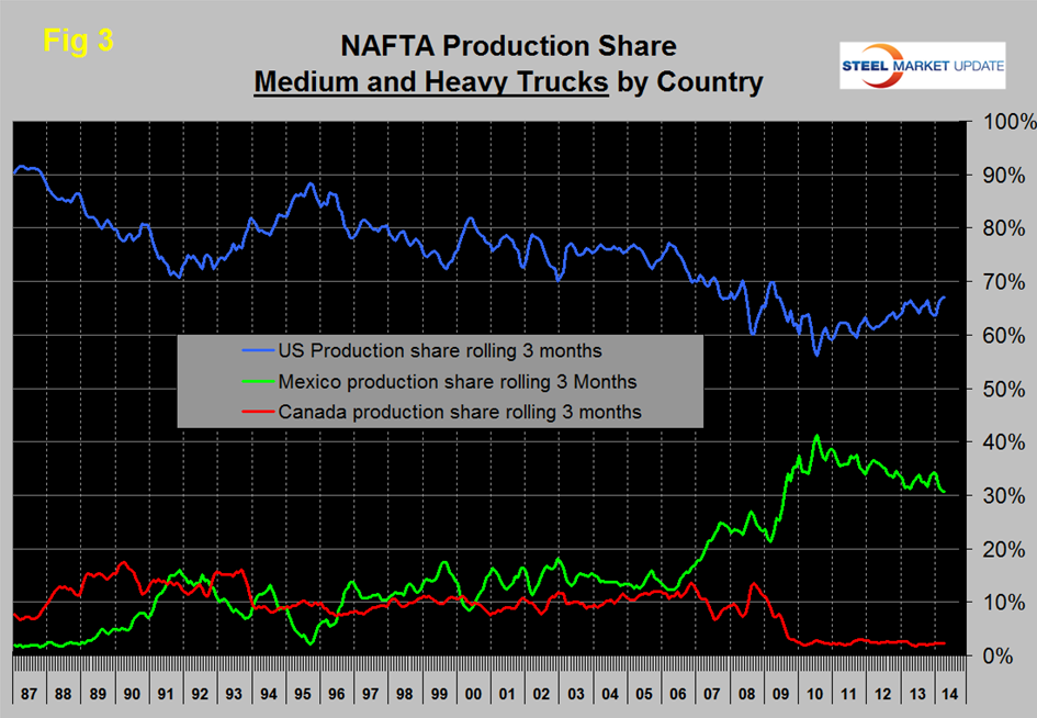 We have reported in the SMU in earlier months that the production share of autos in NAFTA has been trending in favor of the US for over three years. This trend is also very strong for medium and heavy trucks, (Figure 3). It looks as though Canada, with a production share of only 2.3 percent of medium and heavy trucks has been more or less written off by the OEMs as an assembly region.