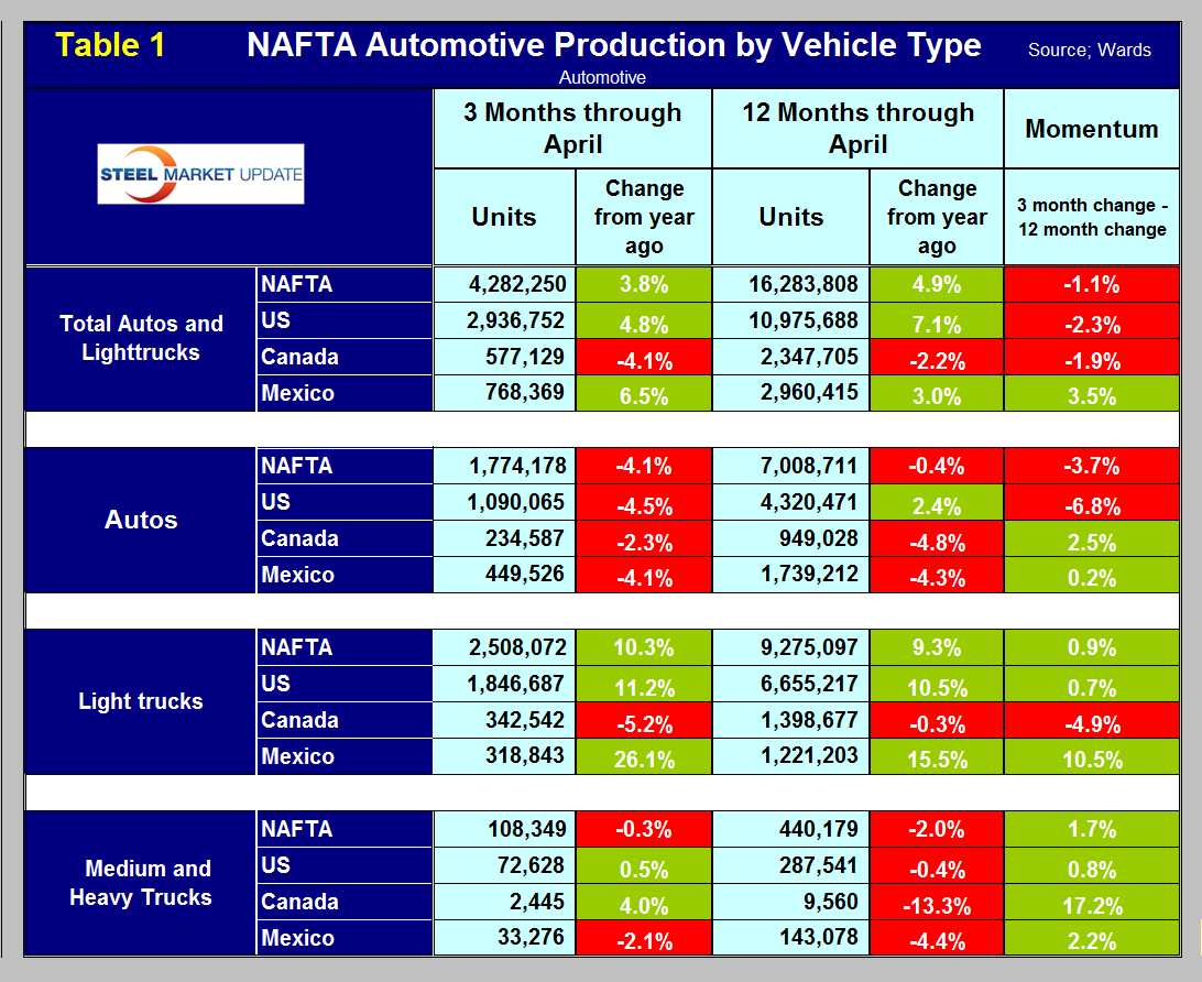 Total light vehicle production in NAFTA in April was at an annual rate of 16,966,644 units. Medium and heavy truck production was at an annual rate of 445,236 units. Light vehicle production in NAFTA declined by 68,936 units in April to 1,483,887 million units. However the rolling three months increased by 3.8 percent from 4,165,434 units to 4,282,250 units. On a rolling 3 months basis the US, Canada and Mexico grew by 4.8 percent, negative 4.1 percent and 6.5 percent respectively. Table 1 shows the growth of autos, light trucks and medium and heavy trucks on a rolling 3 and a rolling 12 months year over year.