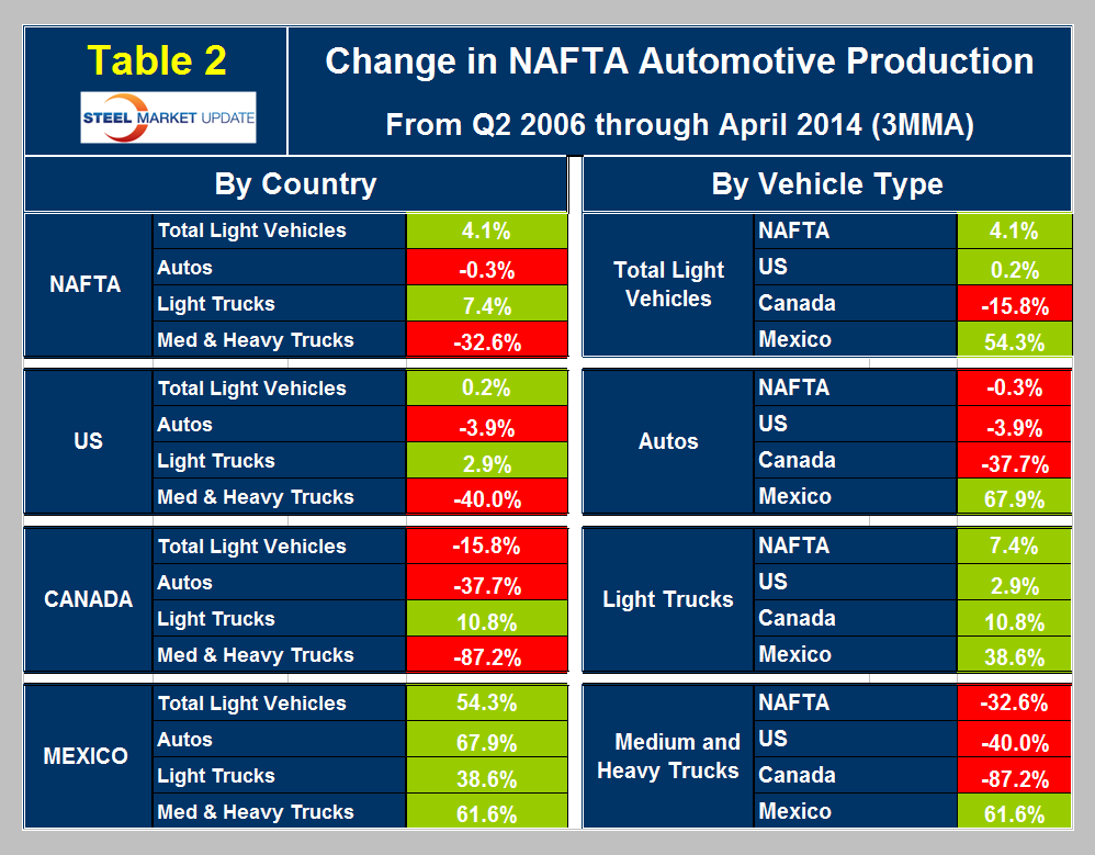 Compared to Feb – April 2013, the production of autos declined in all three countries. The production of light trucks declined in only Canada and medium and heavy trucks declined only in Mexico. Total light vehicle production in NAFTA is now 4.1 percent higher than it was in the pre-recessionary peak of Q2 2006, (Figure 1).