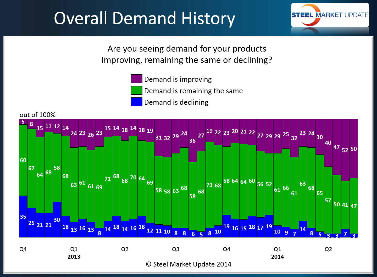 Demand is continuing to improve according to participants in our Steel Market Update (SMU) mid-May Steel Market Survey. Just over half of our respondents, 50.49 percent, said steel demand is improving, up from 47 percent in mid-April and less than one quarter in mid-March.