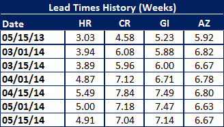 Galvalume lead times remained about the same as the beginning of the month at 6.67 weeks. Galvalume is one product where the lead times last year were relatively comparable to those being measured now. In mid-May 2013, Galvalume lead times averaged 5.92 weeks.