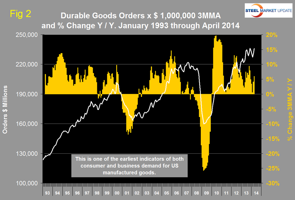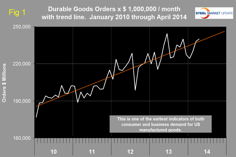 Durable Goods, a measure of the health of the steel industry, saw new orders increase for the fourth consecutive month in April ,continuing the healthy trend that has existed since the recession. Both March and April were above trend, (Figure 1).