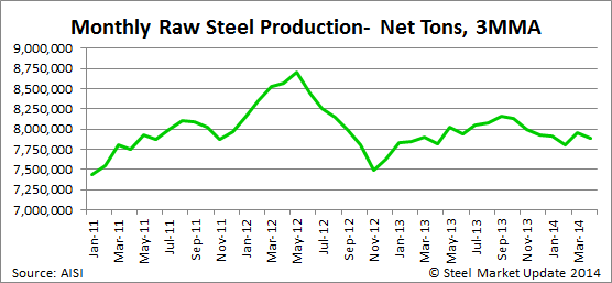 Total raw steel production in 2014 throughout April is now 31,740,263 NT which is 0.5 percent below that of 2013 through the same time period. The capacity utilization rate for the month of April was reported to be 76.6 percent and 77.0 percent for 2014 YTD. (Source: AISI)