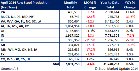 The American Iron & Steel Institute (AISI) reported their final raw steel production numbers for the month of April 2014. This estimation is different than the weekly raw steel production as it is based on 75 percent of the domestic mills reporting vs. 50 percent for the weekly estimates.