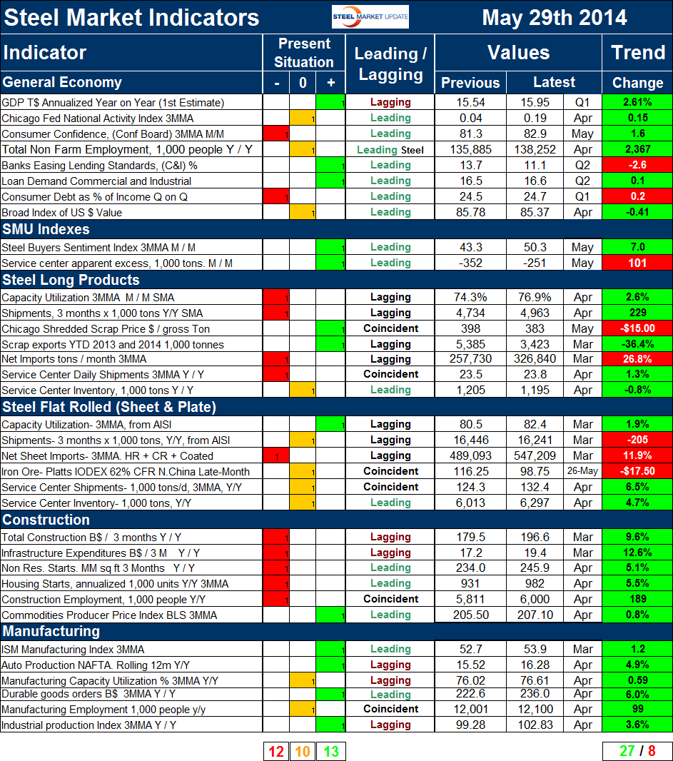 Explanation: The key indicators chart is designed to give a snapshot of the steel market on a specific date. The chart is stacked vertically to separate the primary indicators of the general economy, of proprietary Steel Market Update indices, of both flat rolled and long product market indicators and finally of construction and manufacturing indicators. The indicators are classified as leading, coincident or lagging as indicated.