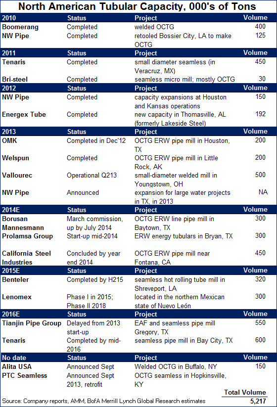 While US Steel is shutting down plants, other OCTG producing companies are either in the process of expanding capacity or have already completed capacity expansion projects. When all of the projects listed in the table below are completed, U.S. companies will have added an additional 5.2 million tons of mostly OCTG pipe production. If you add just the US Steel capacity to the new projects, the total, 7 million net tons, is approximately the size of the entire oil country tubular goods market in the United States.