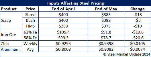 Steel inputs were steady to down during the month of May. Scrap prices declined $18 to $3 per ton while iron ore prices were down $20.60 to $13.60 per ton. Zinc and Aluminum prices showed a slight increased of $0.0105 to $0.0074 per pound.