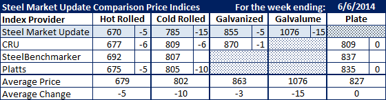 With the latest drop in each of the indexes (with the exception of SteelBenchmarker which did not report new pricing this past week), Steel Market Update has adjusted our SMU Price Momentum Indicator from Neutral to Lower. We believe prices will continue to inch lower in the coming weeks.