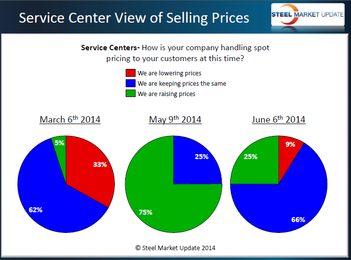 Service centers also shifted their views regarding spot pricing over the course of the past month. Back in early May 75 percent of the service centers reported they were raising spot prices. One month later that number has dropped to 25 percent and 9 percent admit their company had begun to lower prices to their end user customers. It is this shift in support for higher prices that concerns us when it comes to the ability of steel mills to hold prices from here.