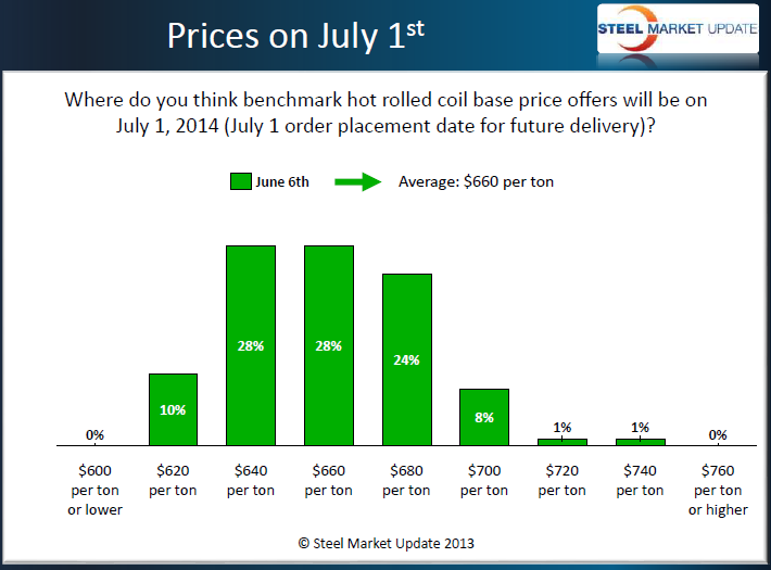 We also asked those taking our survey where they believe benchmark hot rolled price offers will be by the 1st of July. The graph below shows the responses but, as you can see the most popular responses were below our current SMU HRC spot price average of $670 per ton with 66 percent of the respondents believing prices would be at $660 or below by July 1st.