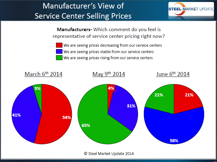 A second area of concern coming out of our market analysis from last week was regarding service center spot prices into the manufacturing segment of the industry. We are seeing the percentage of manufacturing companies reporting receiving lower spot prices from their service centers as growing. A full 21 percent of the manufacturing companies reported distributor spot prices as falling. This compares with only 4 percent one month earlier.