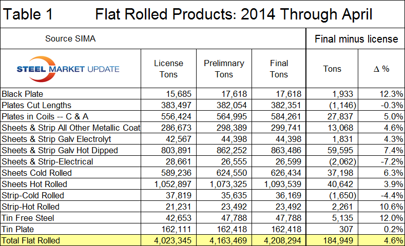 The Steel Import Monitoring system has been a widely used tool to provide an advanced look at import volumes using data compiled from steel import licenses. These licenses can be applied for at any time between when the vessel ships to ten days after it arrives. The total licensed tonnage for any product in a given month is available on the first Tuesday on the following month which is about three weeks before the preliminary numbers and about five weeks before the final numbers are released. We decided to review and publish our findings on the degree to which the license numbers for flat rolled steel products accurately predict the final volume using data for the first four months of 2014, (Table 1).