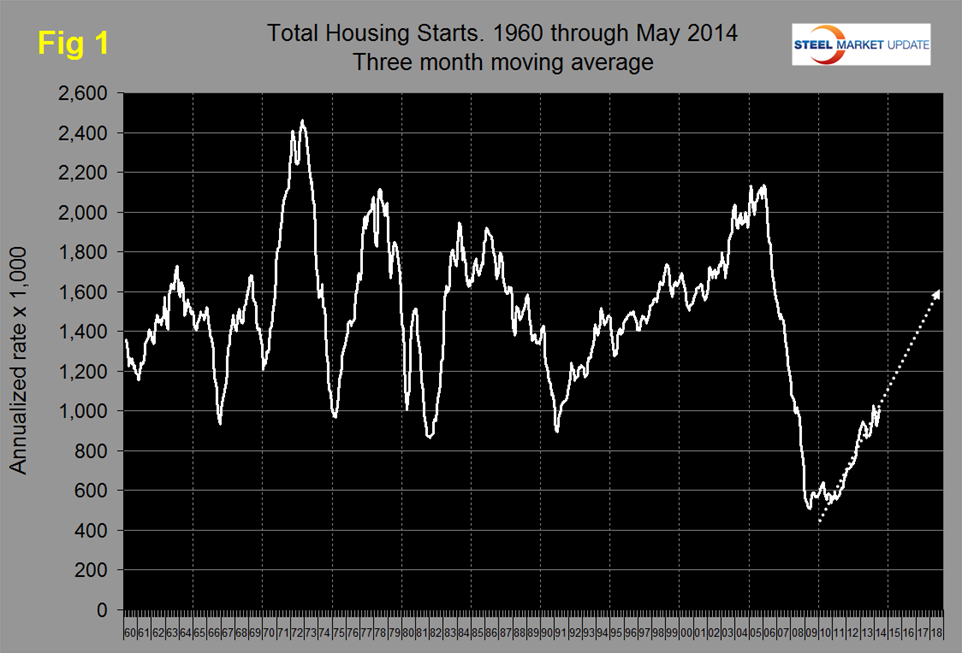 Total housing starts declined from 1,071,000 in April to 1,001,000 in May but the three month moving average (3MMA) increased from 983,000 in April to 1,007,000 in May. It looks as though April was a bounce back from the severe winter delays and that May reverted to trend. Figure 1 shows total housing starts from 1960 and projected through 2018. At the present rate it will be the end of 2018 before total starts break through the 1.6 million annual rate line.